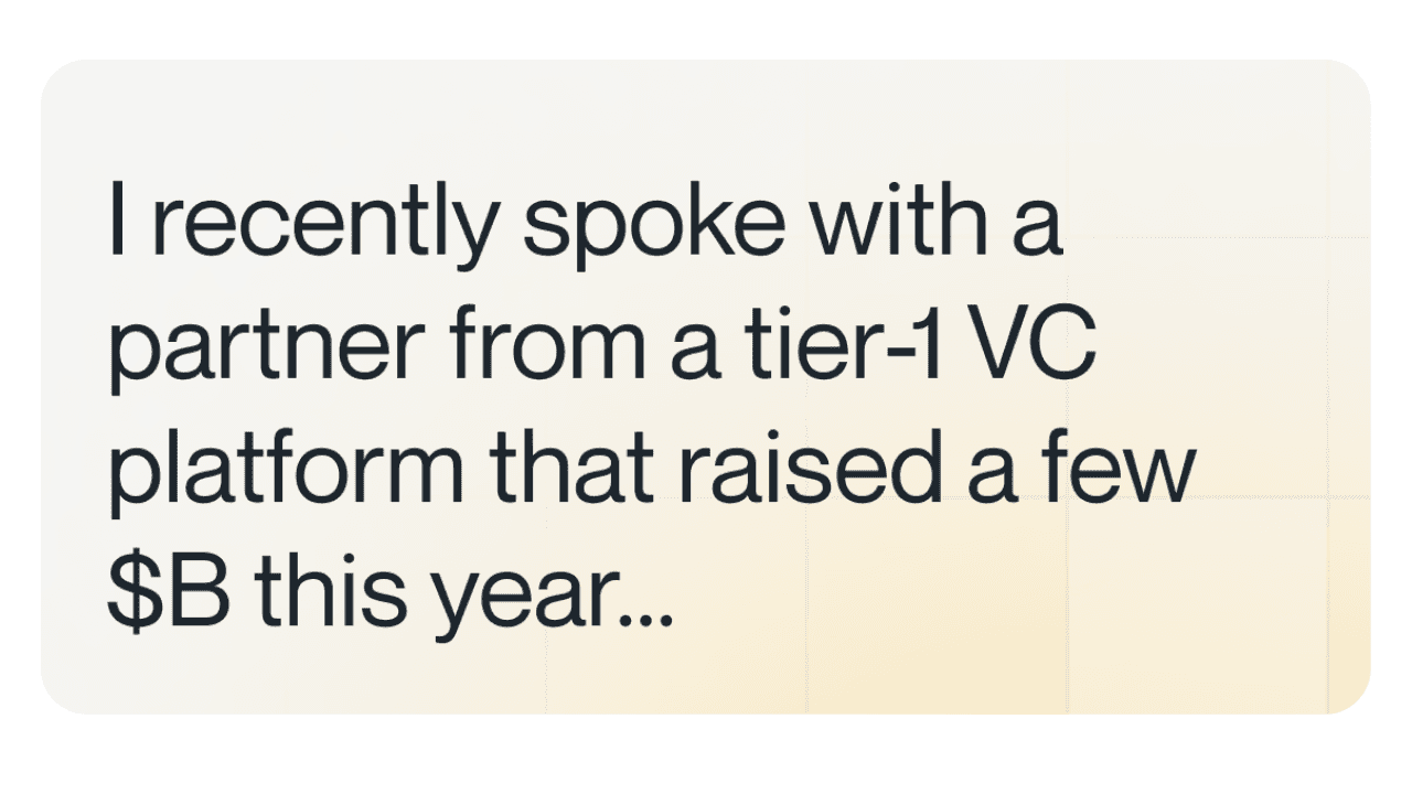 I recently spoke with a partner from a tier-1 VC platform that raised a few $B this year.