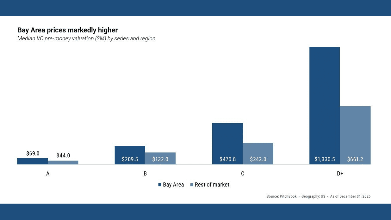 In other words, how much is difference in valuations between AI startups and non-AI startups. Interestingly that the premium still grows as soon as AI company matures - from roughly 1.5x to 2x.